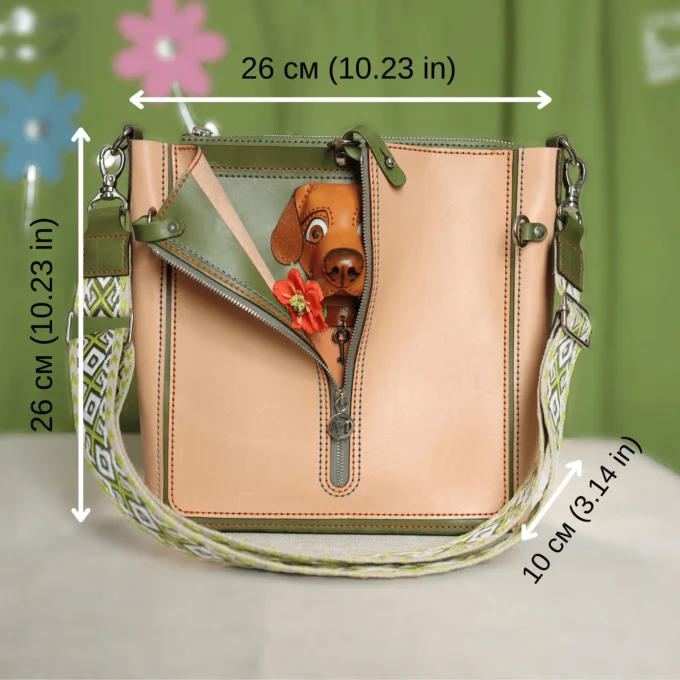 Sized at 26 cm (10.24 in.) wide, 26 cm (10.24 in.) high, and 10 cm (3.94 in.) deep, this bag is practical for daily use. It features a secure zippered pocket on the back panel, plus an interior zip pocket for valuables and an open pocket for quick access items. Whether you’re heading to work, meeting friends, or running errands, this leather handbag with dog design is the perfect mix of function and personality.