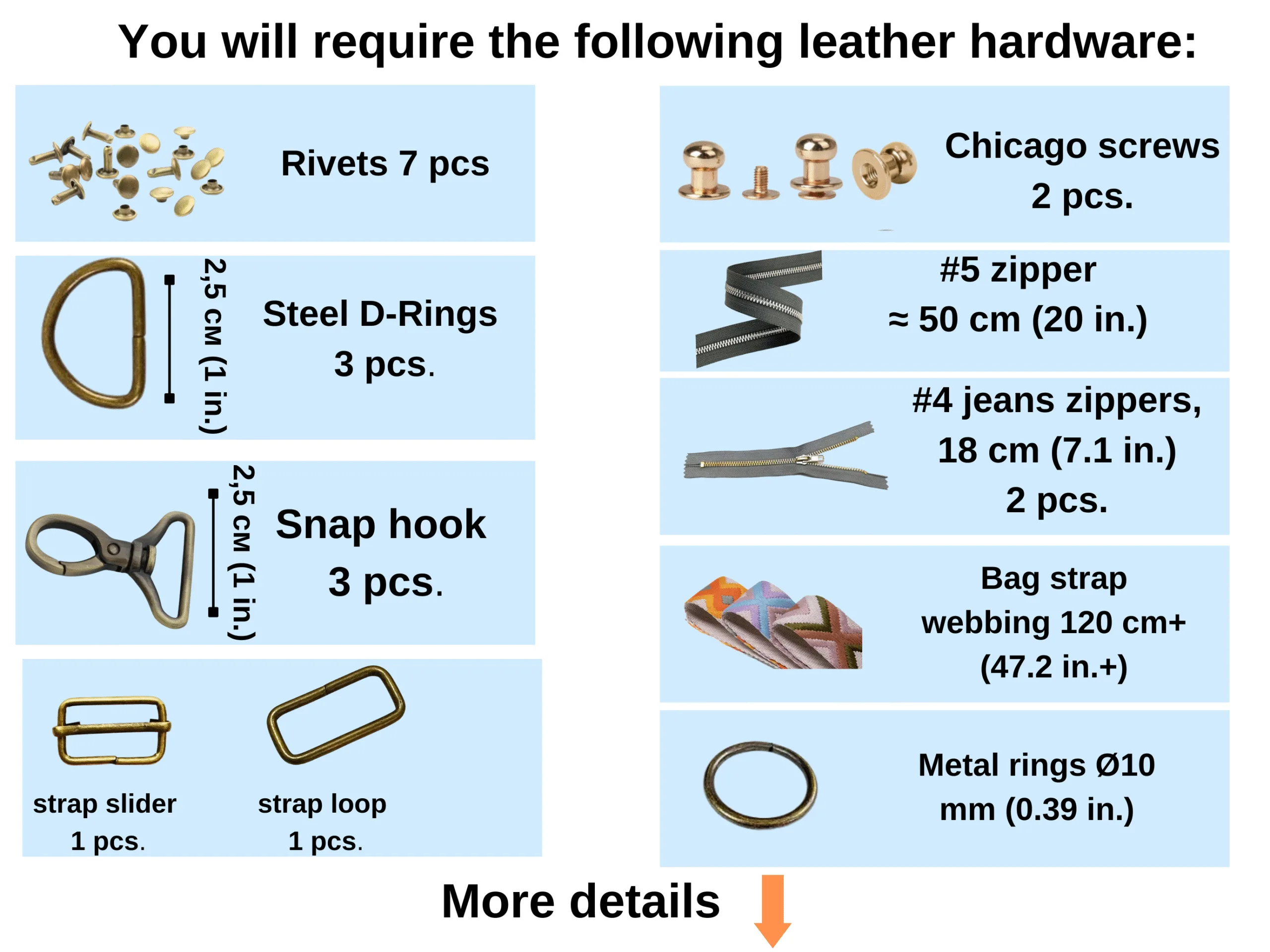 To make this bag, you will need approximately 0.55 m² (851 in²) of leather.