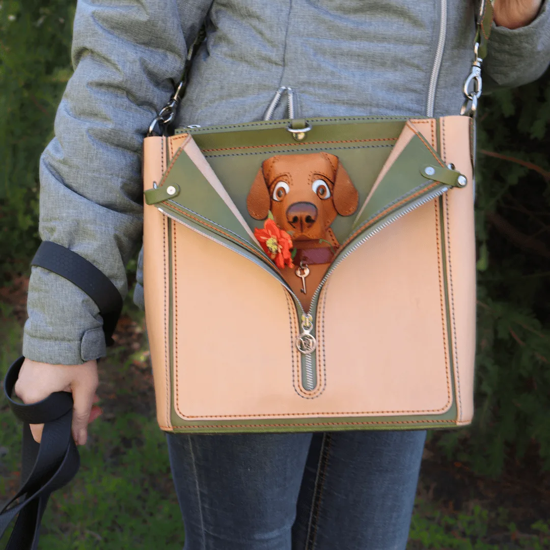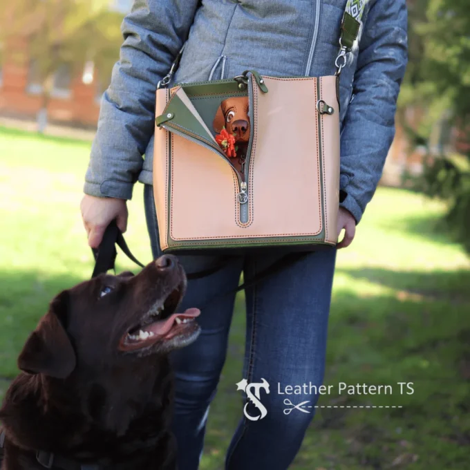 This leather bag pattern is one of my most playful and charming designs. Inspired by the personality of a curious and mischievous dog, the Aiko handbag features a unique front panel where a dog’s face peeks out of the pocket. The design allows you to customize how much of the face is visible: you can show the whole face, cover half so it looks like the dog is playfully hiding, or reveal just the nose for a subtle and cheeky look.