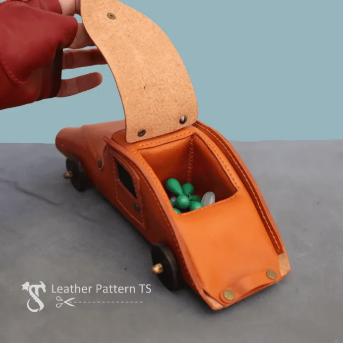 The main charm of this leather car retro pattern is in its simplicity and functionality. It’s easier to assemble than more complex steampunk versions, but it still gives you a detailed and satisfying project. On the outside it looks like a vintage car, while inside it works as a leather car jewelry box. This balance of design and usefulness makes it a great choice for both beginners and experienced leather crafters.