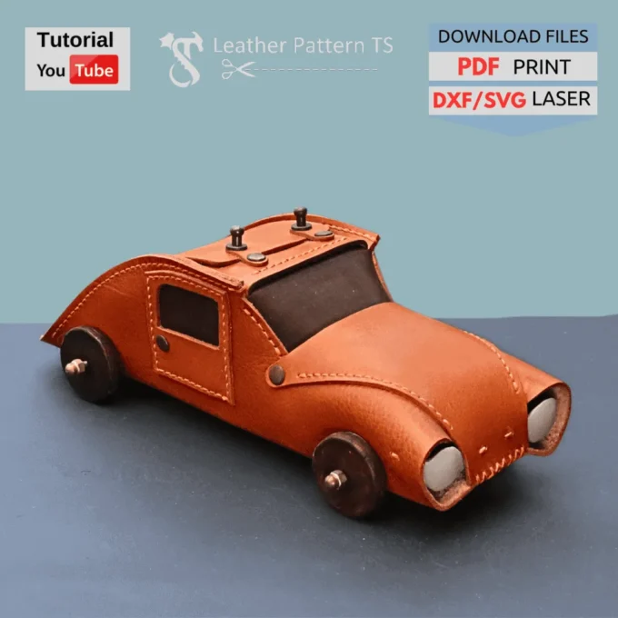 Leather car retro pattern lets me build a vintage-style leather car with a hidden compartment — a leather car jewelry box for rings, earrings, and small keepsakes. From the curved fenders to the rounded headlights, I shape every line with care so the model feels collectible and purposeful right from the first stitch.