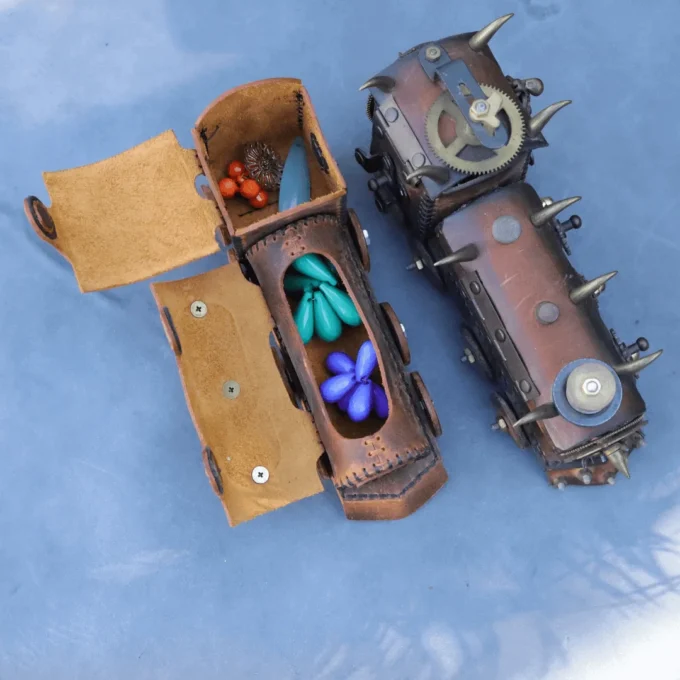 The locomotive form has charm and presence. It’s compact but layered with potential. Whether you prefer a raw leather finish, a colorful accent, or a fully customized steampunk engine — the choice is yours.
