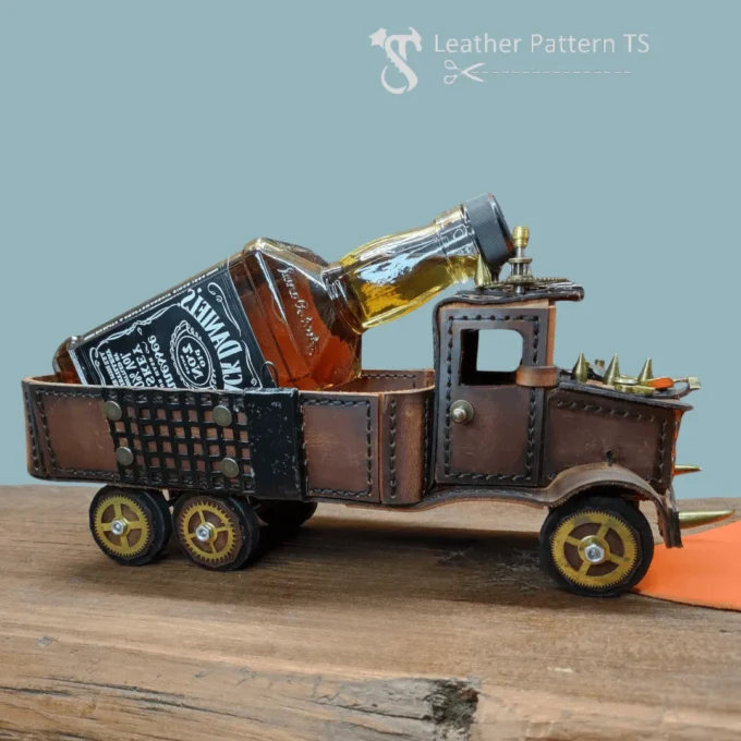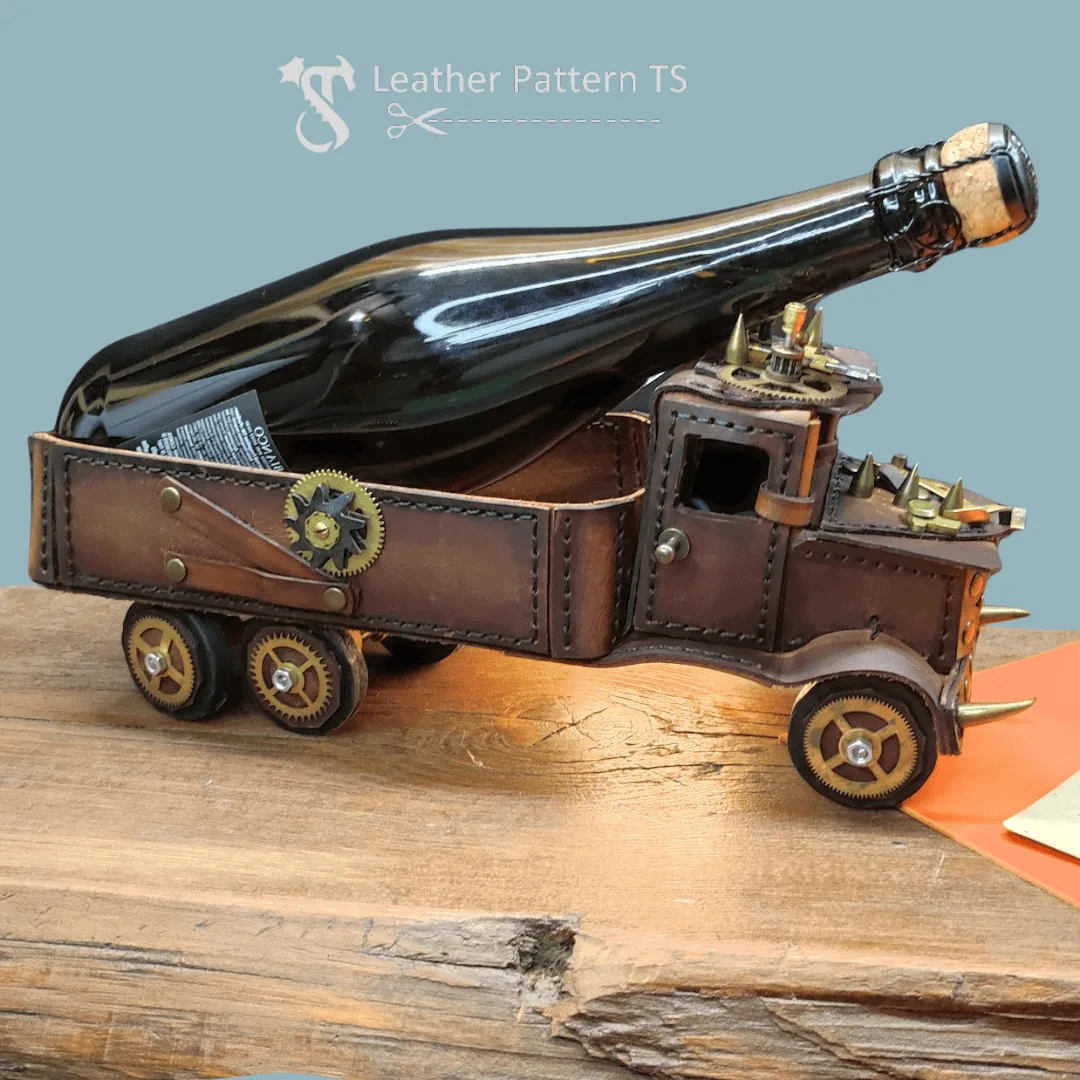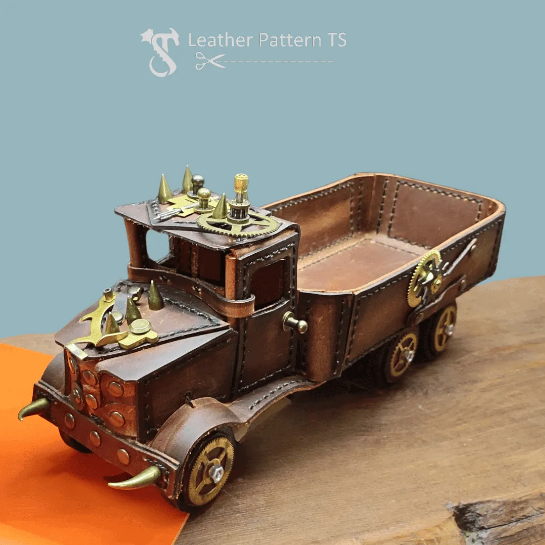 This leather truck pattern PDF includes the base truck structure. It does not include any steampunk elements — those are up to you.