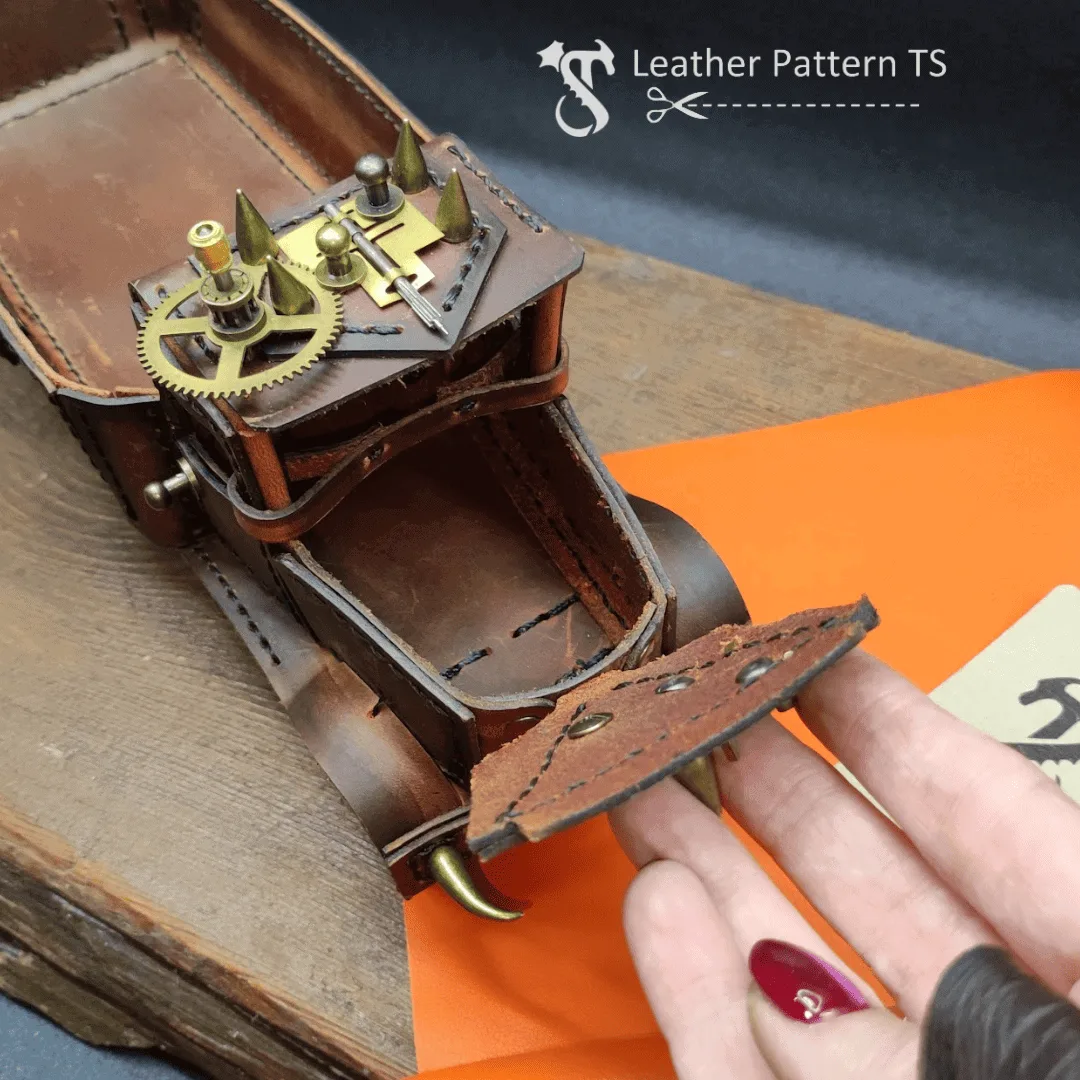 This leather truck pattern lets you build a functional decorative box in the shape of a vintage-style truck. The construction is three-dimensional, structured, and ideal for turning into a one-of-a-kind centerpiece. Whether you want to create a steampunk truck full of gears or keep it minimal — the base design gives you full creative freedom.