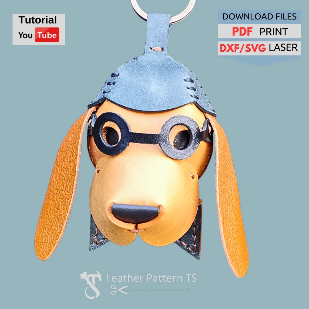 Pattern leather dog backpack with PDF, SVG, DXF & video. DIY leather dog charm – a cute keychain with glasses and a hat for bags or keys.
