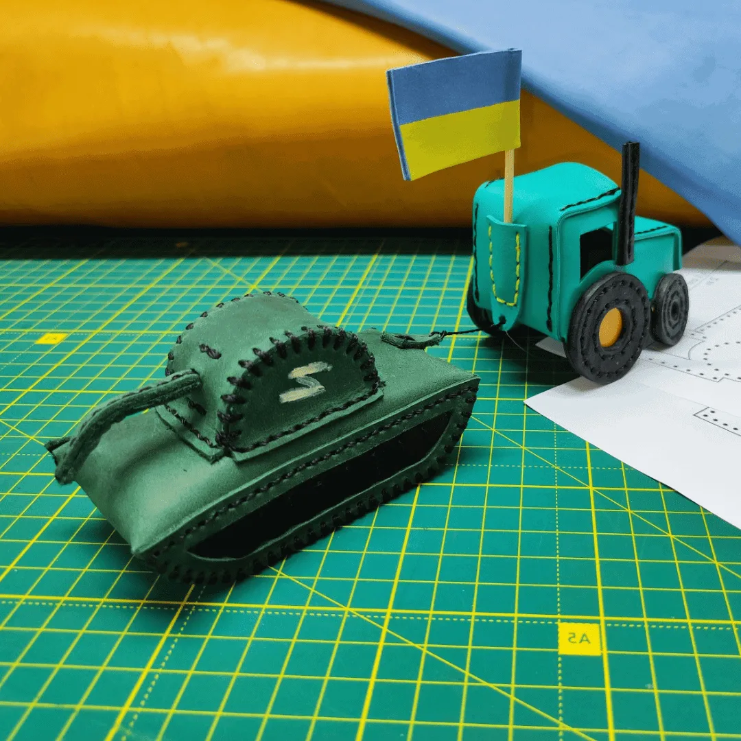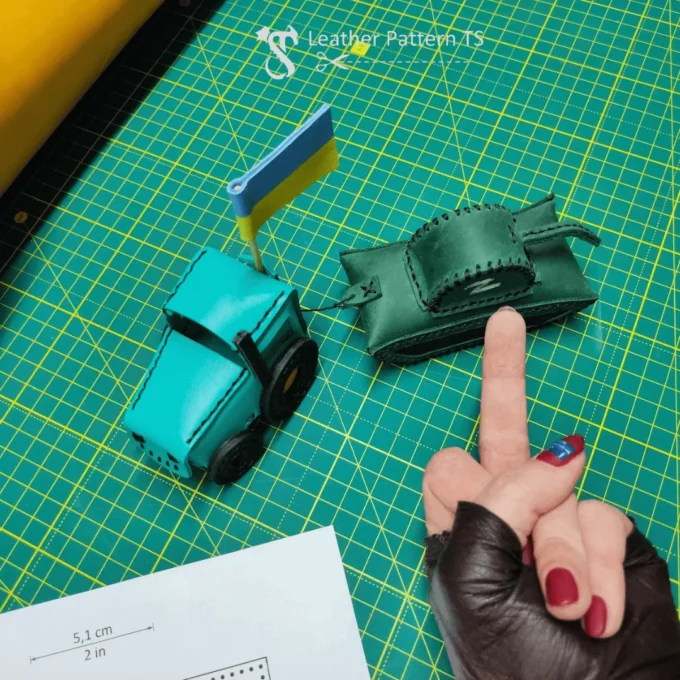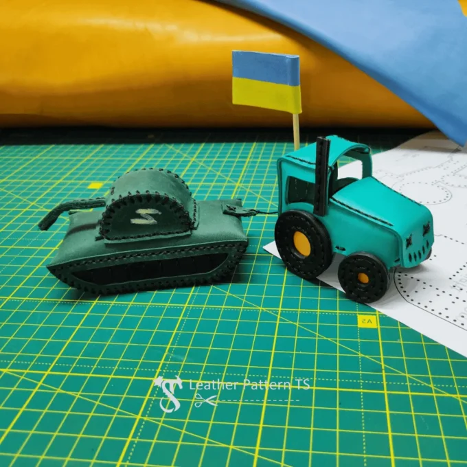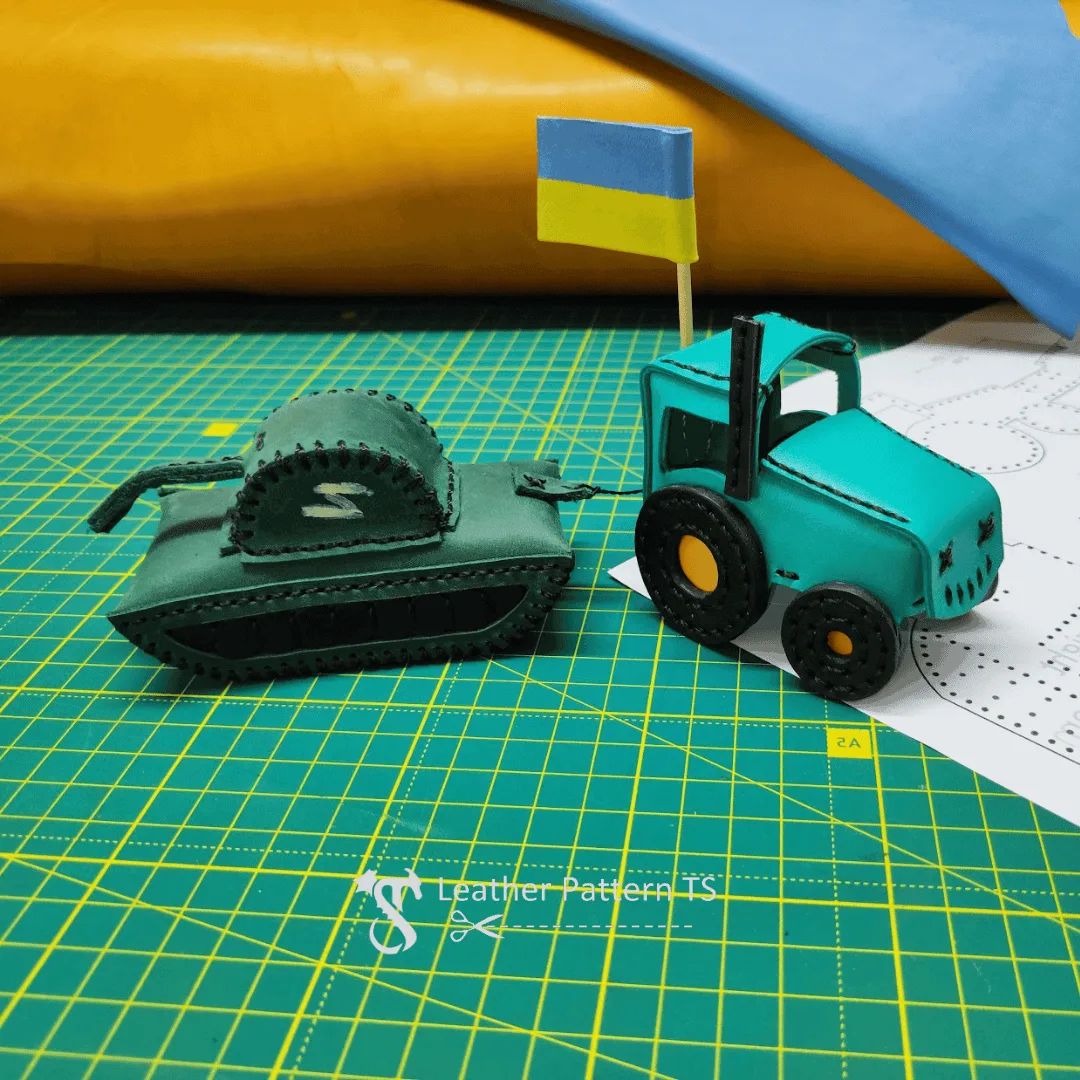 I wanted the shapes to be iconic and readable from across the room. The tractor has stacked planes and crisp joins; the tank silhouette is bold and instantly recognizable, with contours that feel strong without being fussy. If you’ve been looking for a leather tank pattern and a leather tractor pattern that match in style, this coordinated pair lets you build a tiny scene that tells a very specific story—about everyday people, quick wit, and bravery.